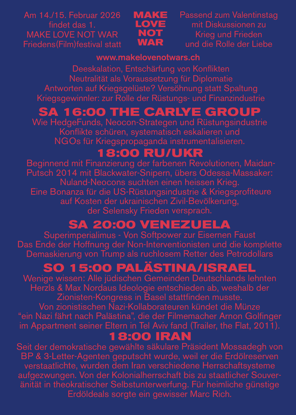 Don't miss www.makelovenotwars.ch – Movies & Clips mostly in english. Discussions mostly in german, but also in english. Sa. 16:00 The Carlyle Group 18:00 Ukraine on Fire 20:00 Venezuela and the impact of the Embargo on Cuba, Superimperialism on Steroids - Recent News and Clips from The Grayzone 21:15 Valentino-Latino Music-Bar & Virgin Drinks. More Latino Music and other Drinks at Eddys Weinstube 🙂